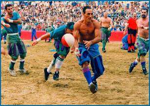 Per quanto non conosciamo l’origine del gioco del calcio, a Firenze era certamente praticato già a partire del XV secolo, stanti alcuni decreti della Repubblica che lo vietavano in alcune zone della città. Patrimonio collettivo della cultura cittadina, il gioco venne usato dai fiorentini come provocazione nei confronti delle truppe imperiali all’epoca dell’assedio (1529-1530) a dimostrazione della loro non curanza della fame e delle malattie che avevano colpito la città. A partire dalla fine del XVI secolo, il gioco diventò appannaggio della nobiltà, che lo praticava nelle piazze principali della città - Santa Croce e Santa Maria Novella - con grande concorso di pubblico. Il ‘Calcio in livrea’, dall’uso delle divise che distinguevano i membri delle due squadre, spesso guidate dal granduca stesso o da personalità della corte, diventa quindi dimostrazione, così come del resto i tornei e le armeggerie, dell’abilità e della prestanza fisica della classe dominante.